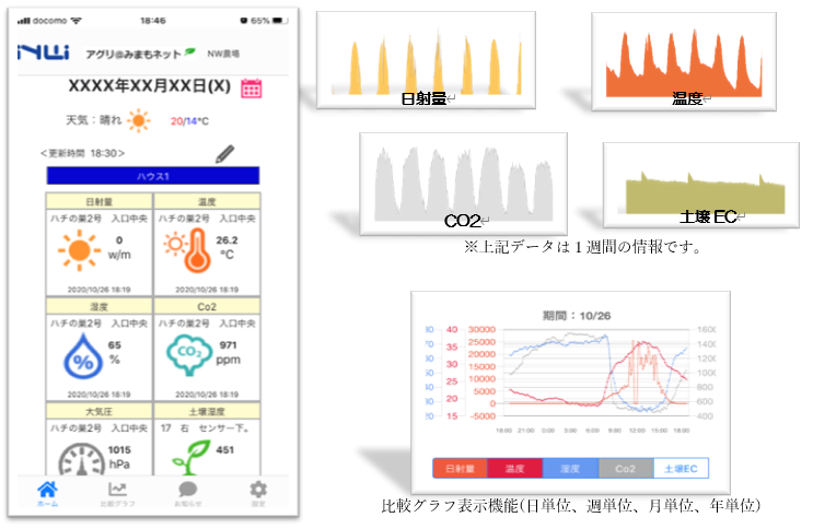 | ⑤ | 表示項目 | 温度、湿度、CO2、気圧、日射量、土壌EC、土壌温度、ブロアーファン稼働状態(稼働中/停止)、比較グラフ、アラート情報etc | ||||||